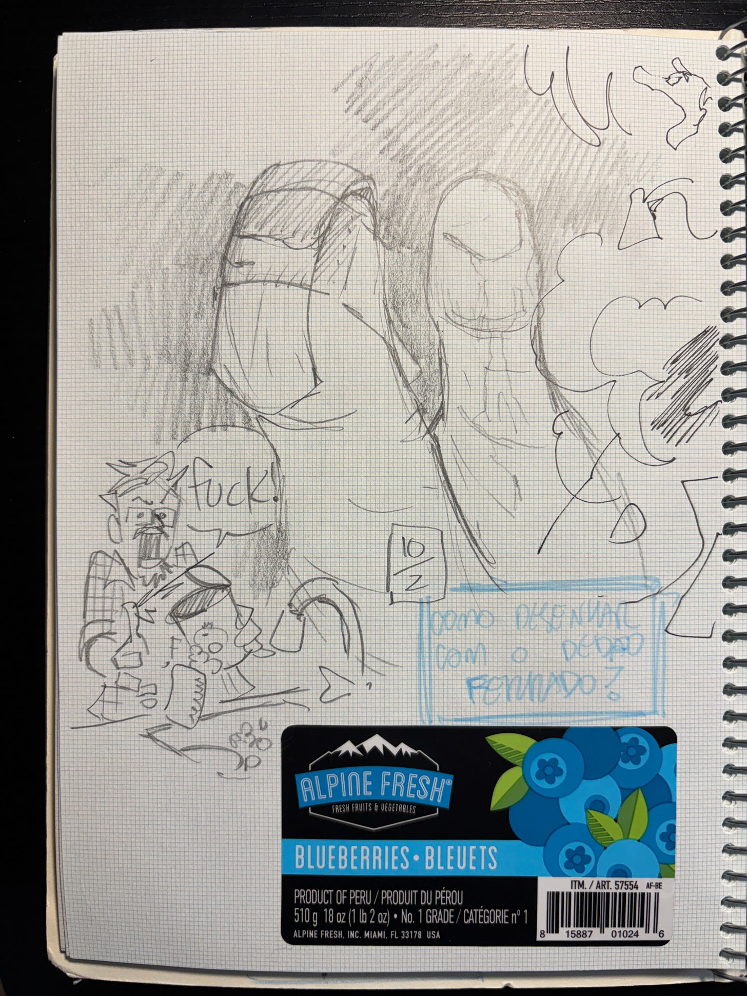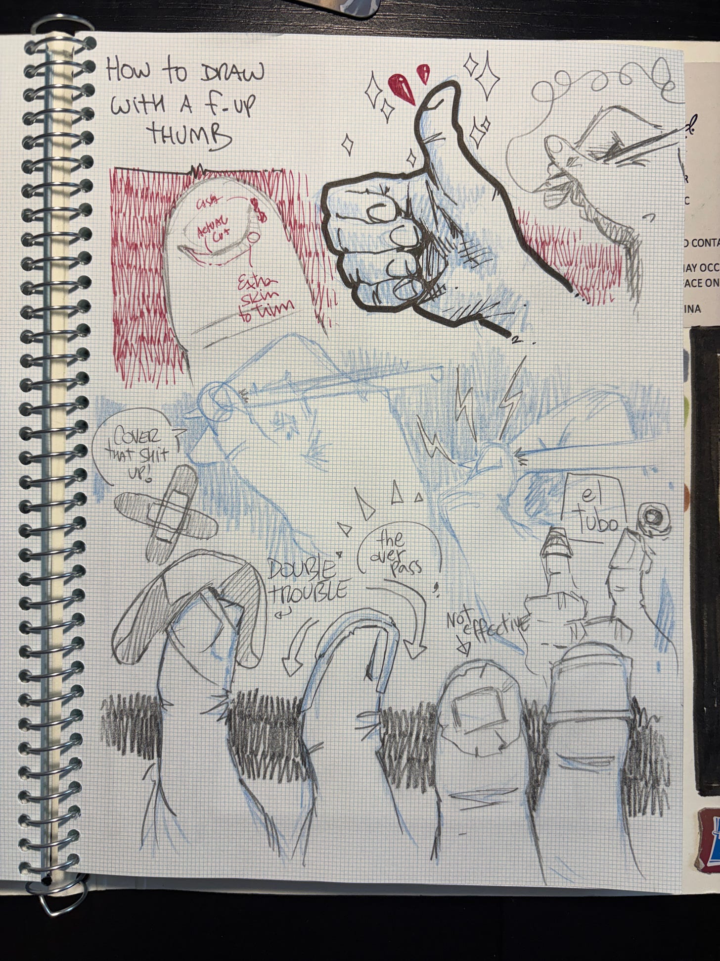 Depois de ver o 30º caderno, aqui tem algumas coisas do meu caderno atual, o 71º. Especialmente focado no meu dedão, ferido por uma malandra lata de tomate pelado, que atrapalhou quase tudo que faço na vida por uns bons dias. Cuidem bem dos seus polegares opositores!