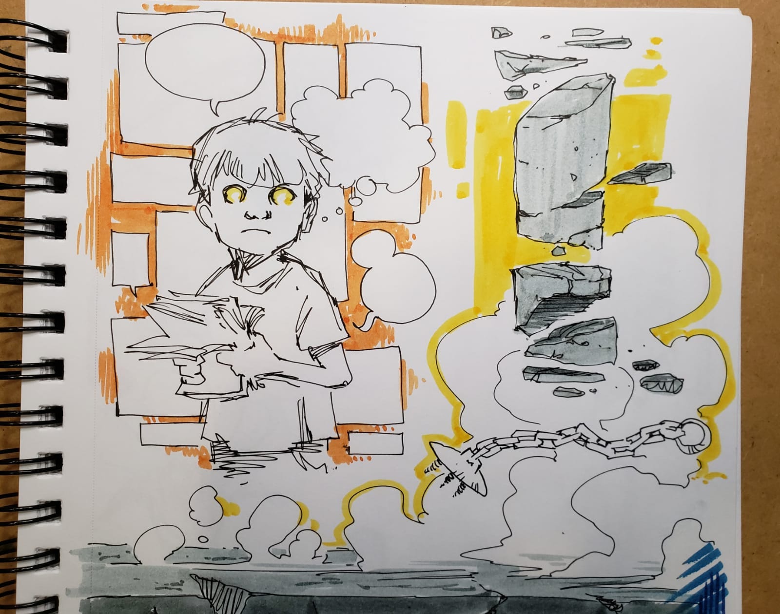 Como já disse antes, meus últimos anos foram permeados de pequenos projetos aqui e ali, freelas e mentorias, mas tem dois projetões de quadrinhos se alternando na prancheta. Sou o arte-finalista de ambos. Tinha te contado que um deles estava estacionado há meses, enquanto o outro começou com tudo. No momento em que escrevo, o que estava parado já voltou com tudo e o que estava rolando parou um pouco. Meio doido, mas continuamos em frente.